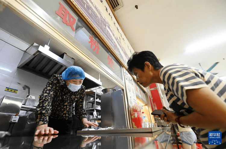 8月14日,黄天玲(左一)在广西南宁市水街一家米粉店里给顾客的生榨米粉加油条。新华社记者陆波岸 摄