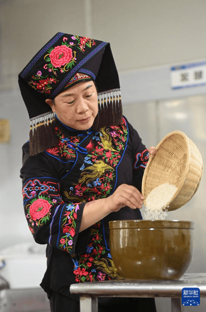 8月13日,黄天玲在广西南宁市将浸泡好的大米加入磨盘准备磨浆。新华社记者陆波岸 摄