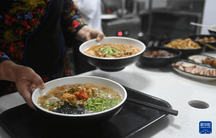 8月13日,黄天玲在广西南宁市为生榨米粉加配料。新华社记者陆波岸 摄