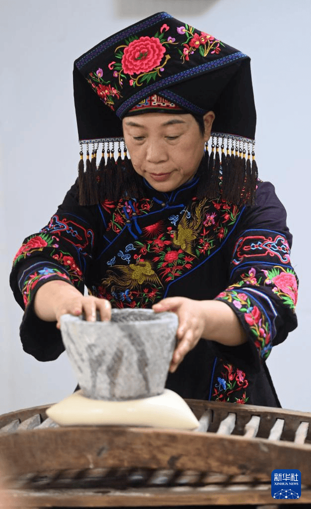 8月13日,黄天玲在广西南宁市舂粉准备制作生榨米粉。新华社记者陆波岸 摄