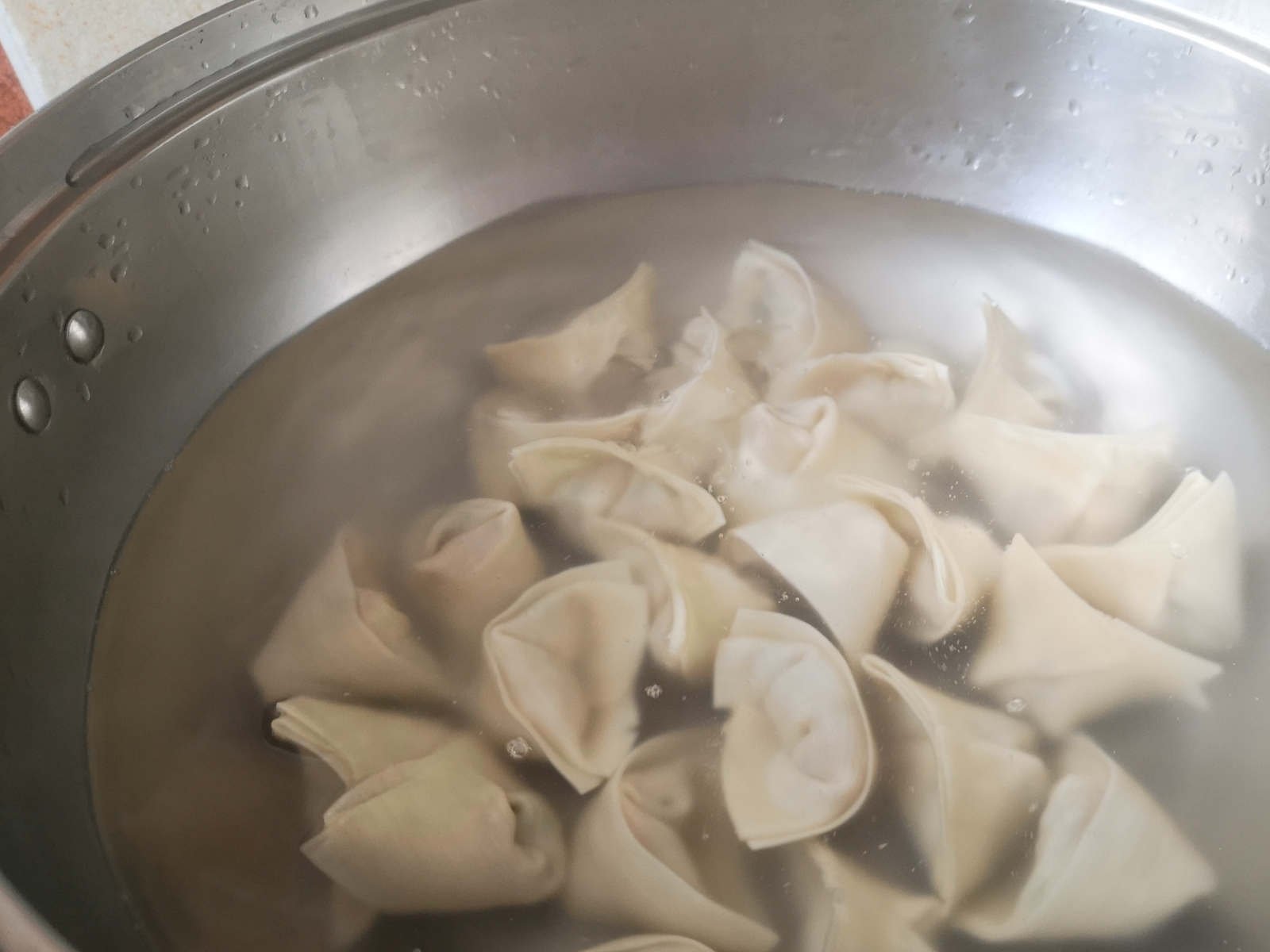 5、锅中放入适量的清水煮开,然后将包好的馄饨放入锅中煮熟。水稍微多一点,一会需要用到。