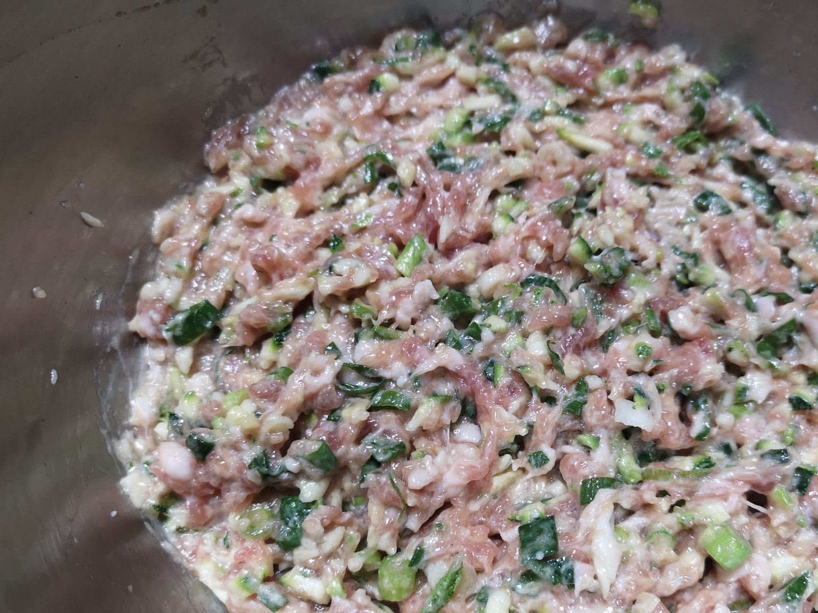 1、猪肉购买的时候,让店家打成肉馅儿。肉馅中分2~3次加入适量的清水,顺一个方向搅拌均匀,每次都要等到肉馅将水分吸收后再加下一次。肉馅中放入适量的胡椒粉,生抽,姜末,搅拌均匀腌制10分钟。加入适量的西葫芦碎,葱花。