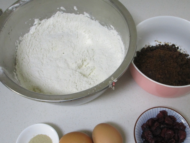 详细做法请往下看;需要的食材;面粉400克鸡蛋2个红糖120克酵母4克水200克蔓越莓干少许