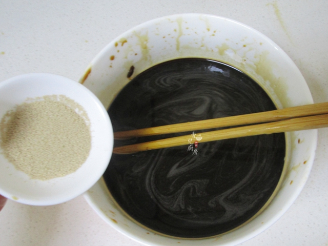 红糖里先加入100克热水,搅拌至全部融化后再倒入冷水100克,拌匀后就变成温水,再把酵母倒入搅拌均匀