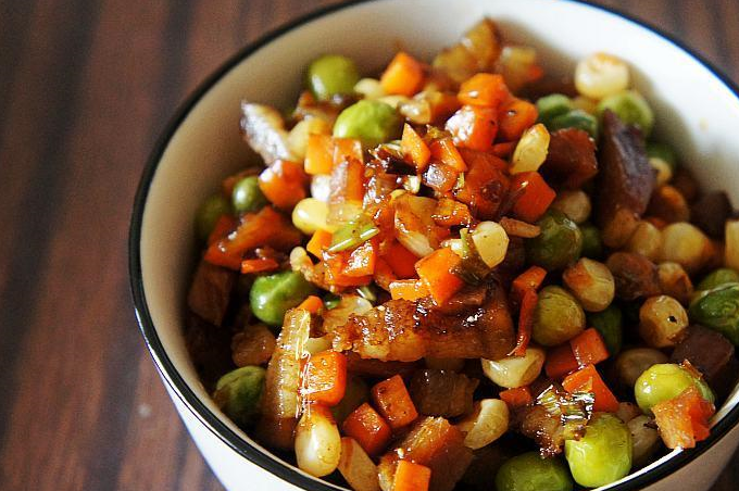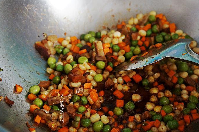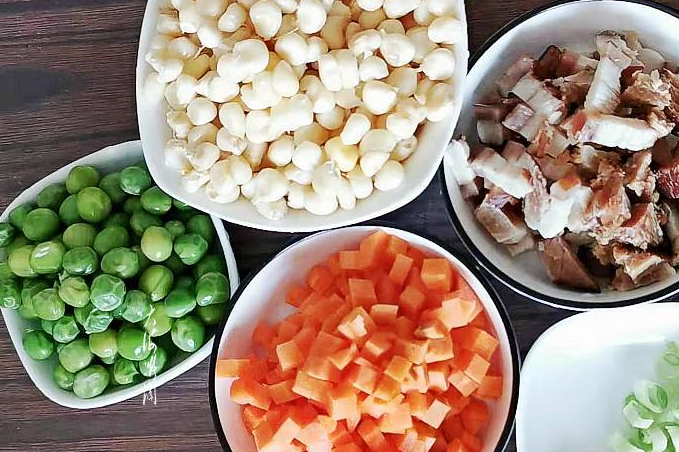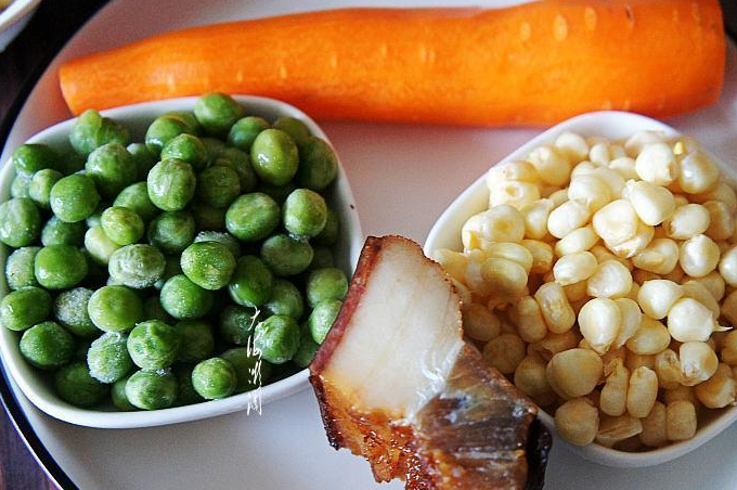 做法及步骤:1、胡萝卜去皮洗净;玉米粒是熟玉米粒;豌豆粒是之前买回来冻在冰箱里的生豌豆粒,需要煮熟;腊肉是来自广西自家腌制的腊肉。