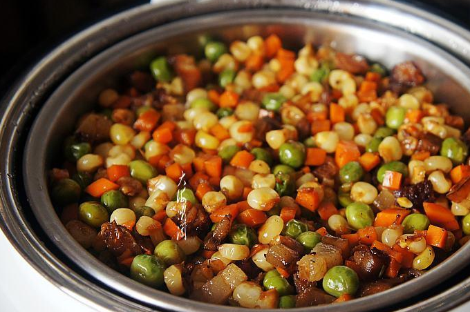 2、如果配菜都是熟菜不要同时和米一起焖,最后10分钟足够了,否则时间太长,蔬菜营养价值会降低,而且口感不好。