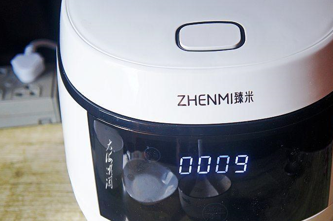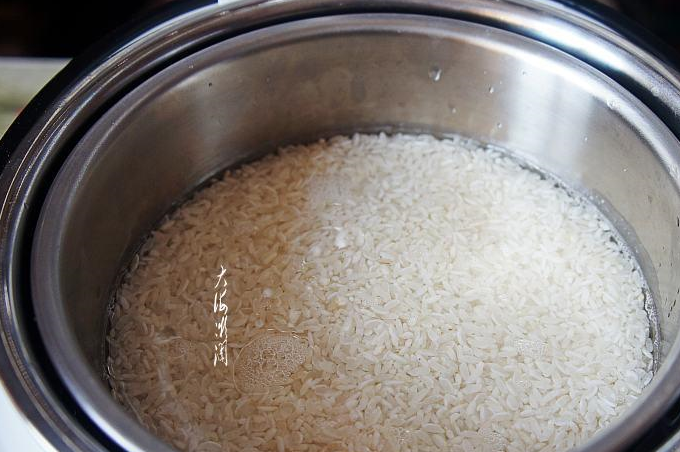 5、放入电饭煲,水位高出米1厘米即可,盖上锅盖设置蒸饭功能,启动电源。