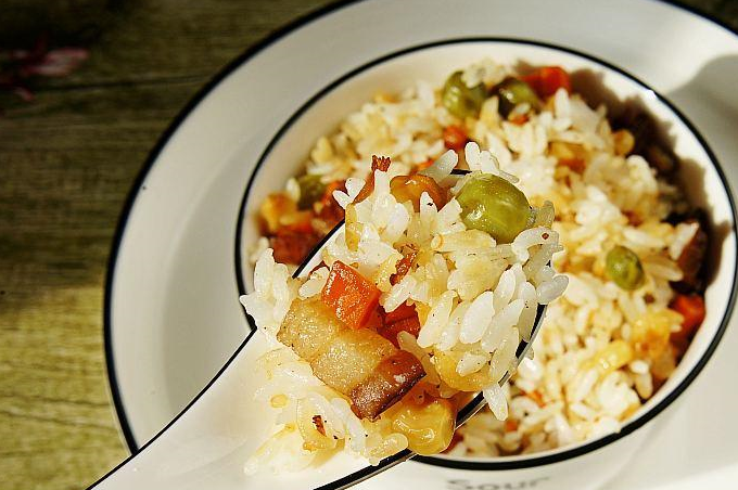 【腊肉焖饭】所需食材:大米200g;玉米粒1小盘;豌豆粒1小盘;胡萝卜半根;腊肉1块;油适量;盐适量;葱适量;五香粉适量;胡椒粉适量;味极鲜酱油适量。