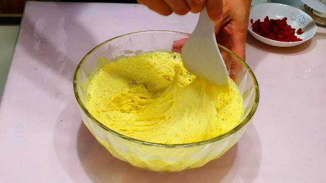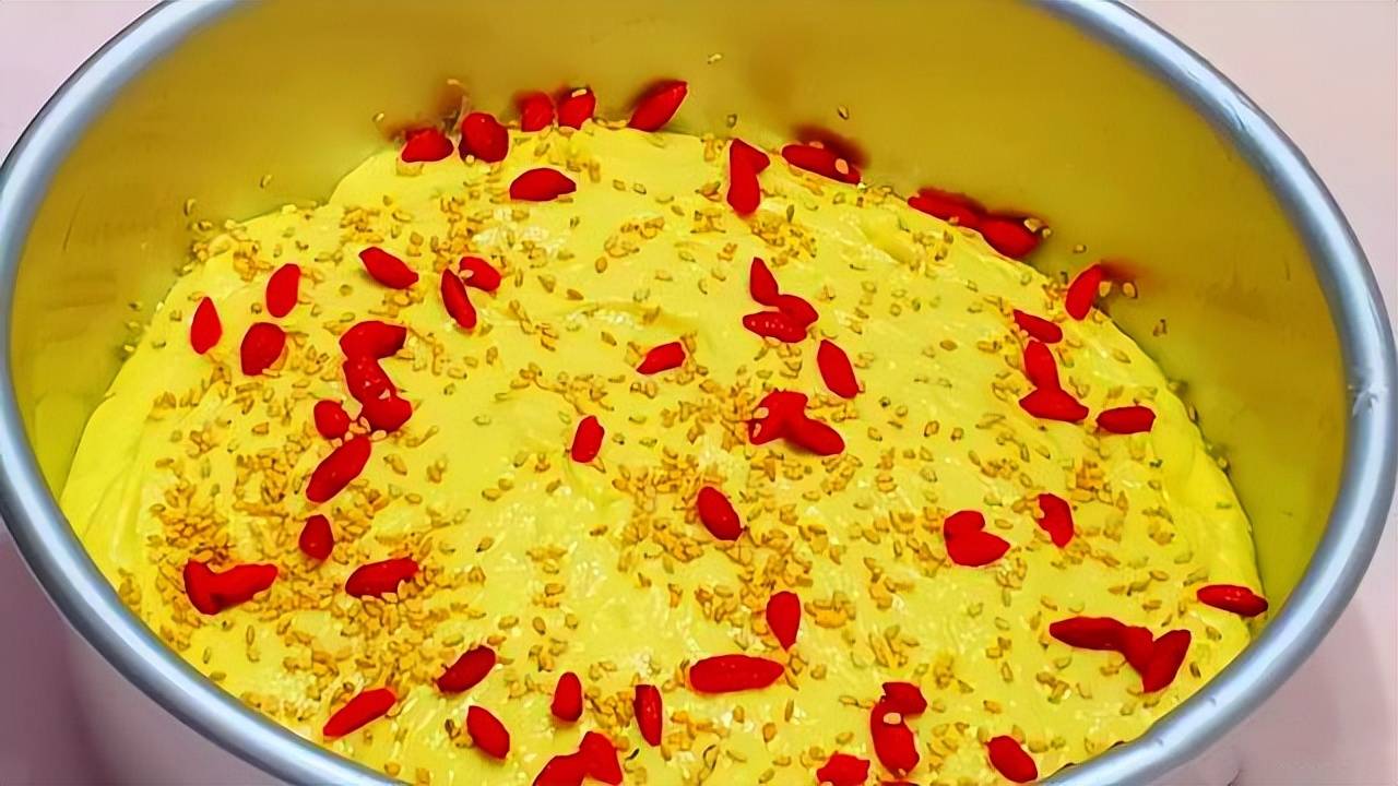 5.然后我们取一个做蛋糕用的模具,内壁涂上一层食用油防止粘连,再把搅拌好的面糊倒入模具中,将模具振动几下,如果不够平整,再用铲子整理一下,接着撒上适量的枸杞和白芝麻(也可以撒各种自己喜欢吃的干果),再把它放到温暖的地方二次醒发15分钟左右。