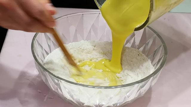 3.接着在打好的红薯泥中分少量多次加入面粉(大约180克左右),一边加面粉一边用筷子轻轻搅拌,搅拌至浓稠的面糊状后,再盖上一层保鲜膜,放一边自然发酵至两倍大,约需半小时左右。