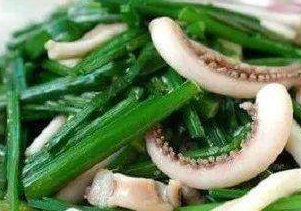 3.再将鱿鱼切成丝,韭菜洗净切成段