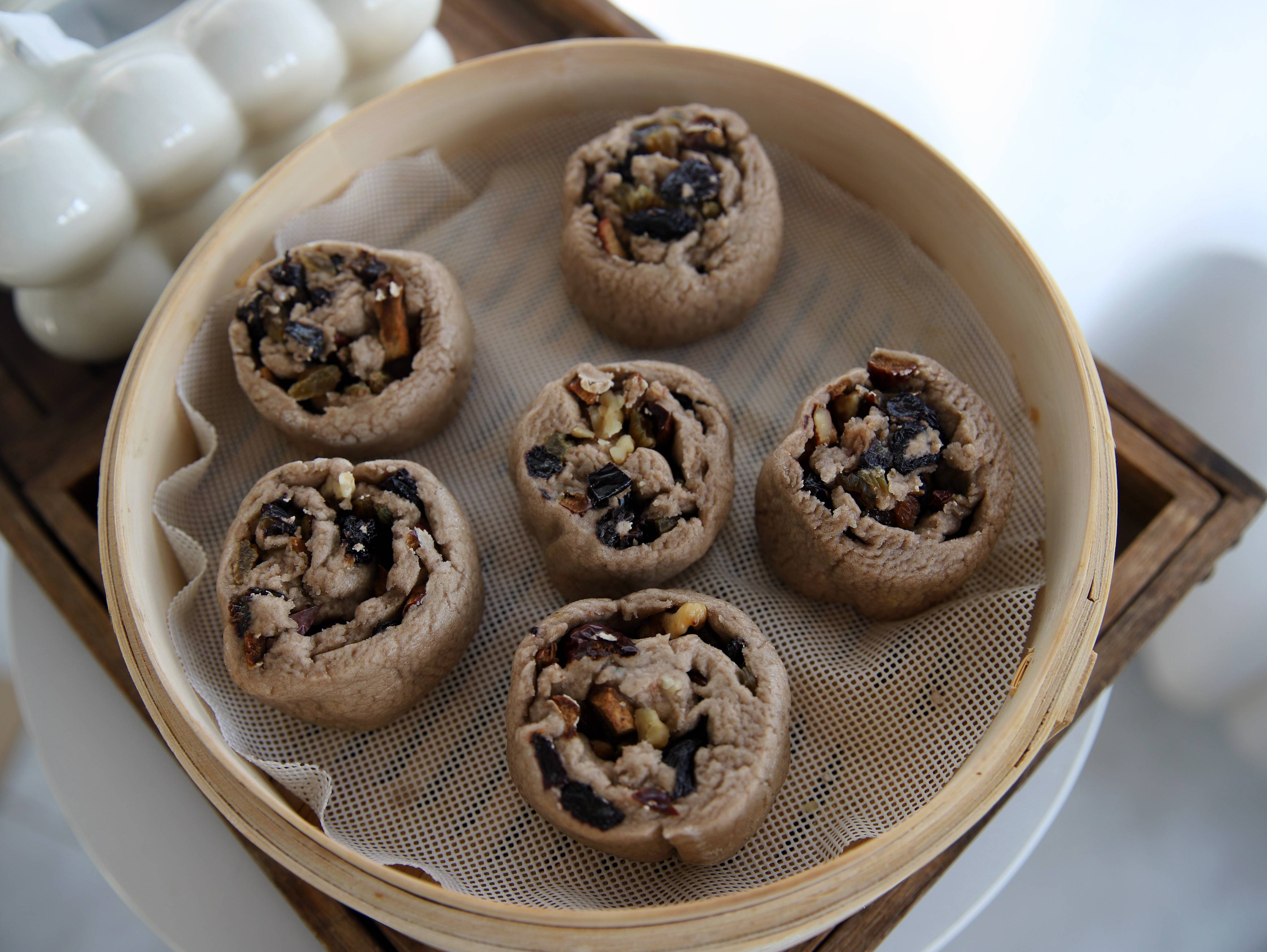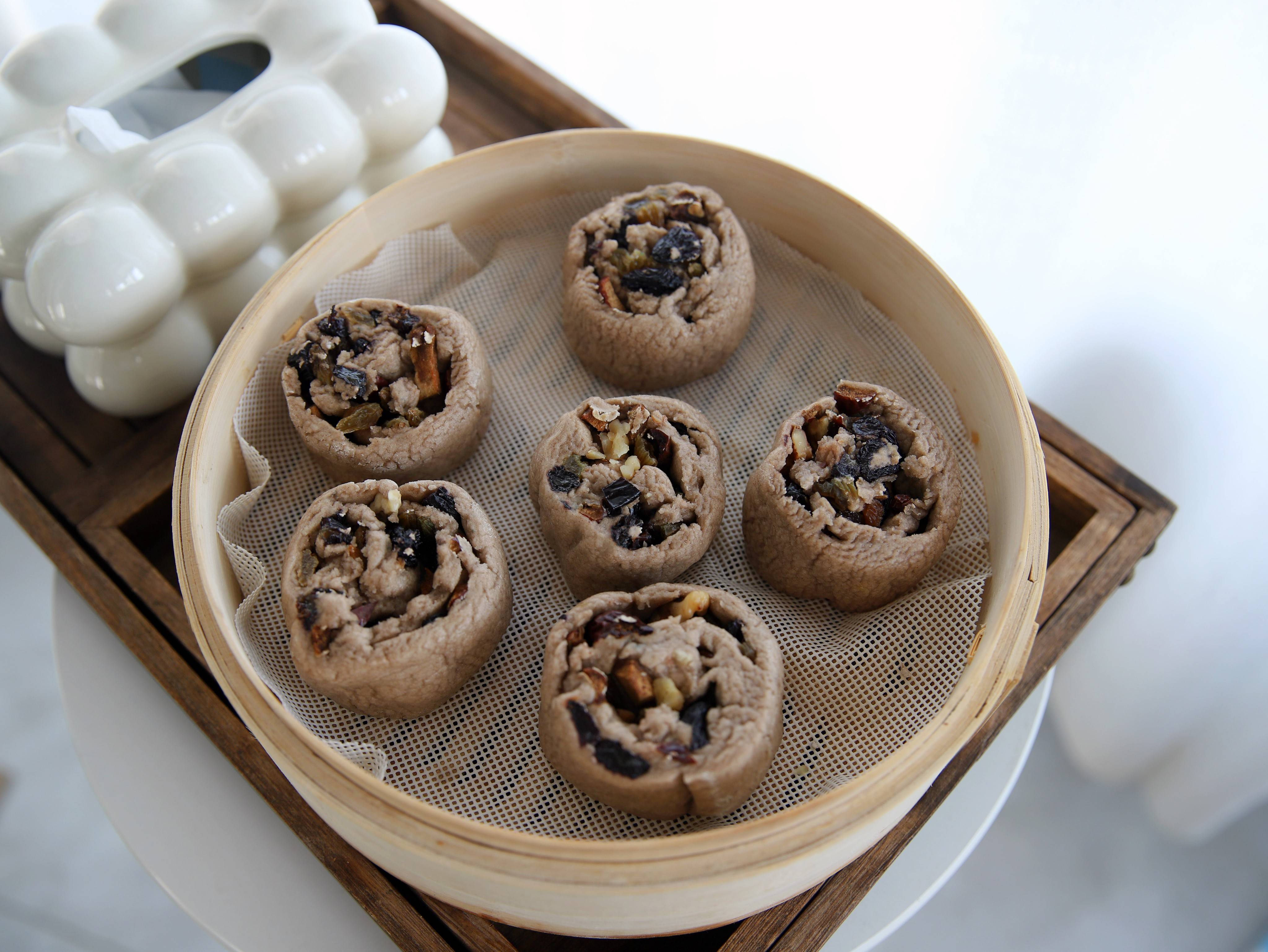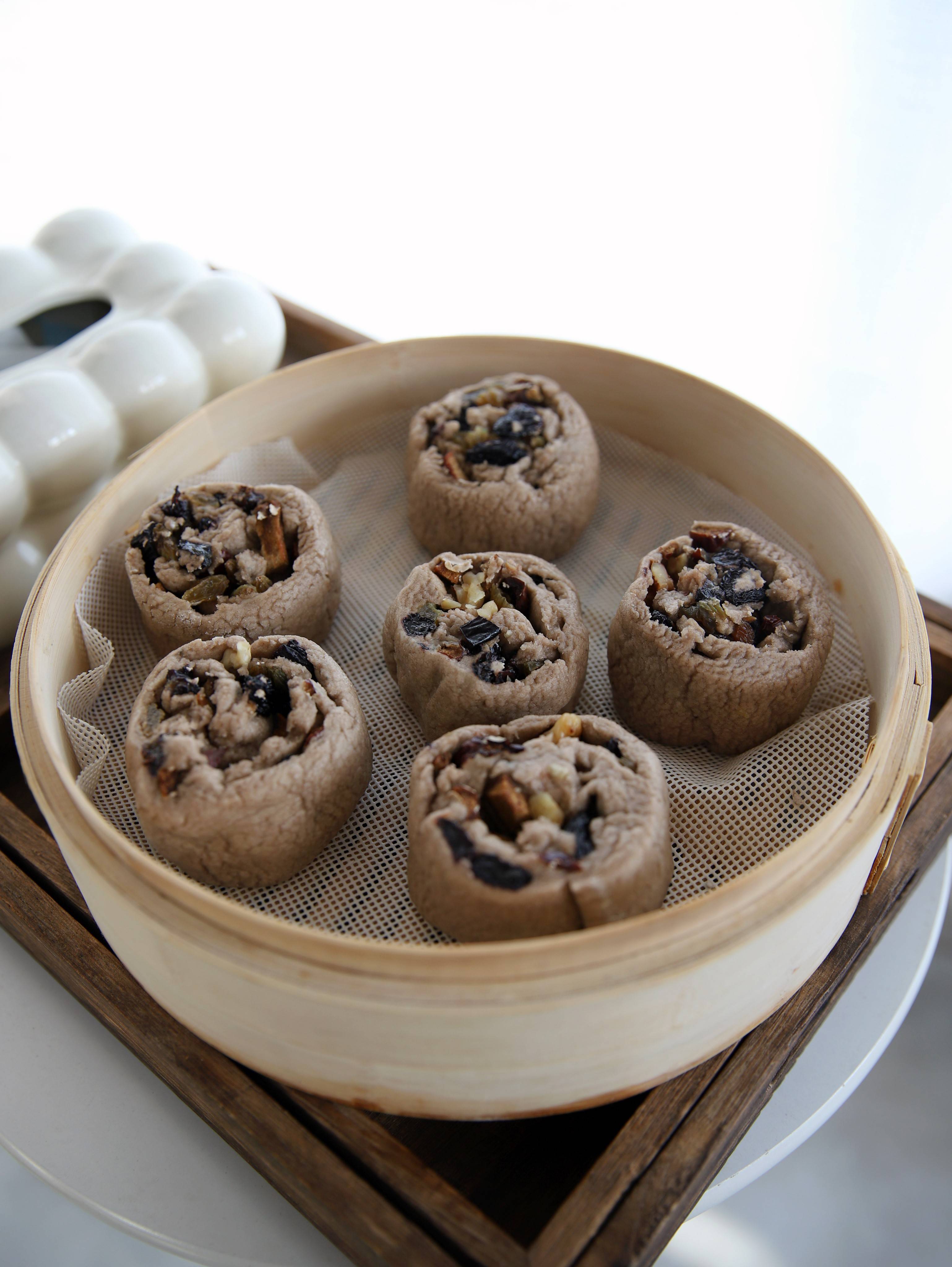 用料:荞麦粉500克,清水270克,酵母粉5克,葡萄干适量,红枣适量,熟核桃碎适量。