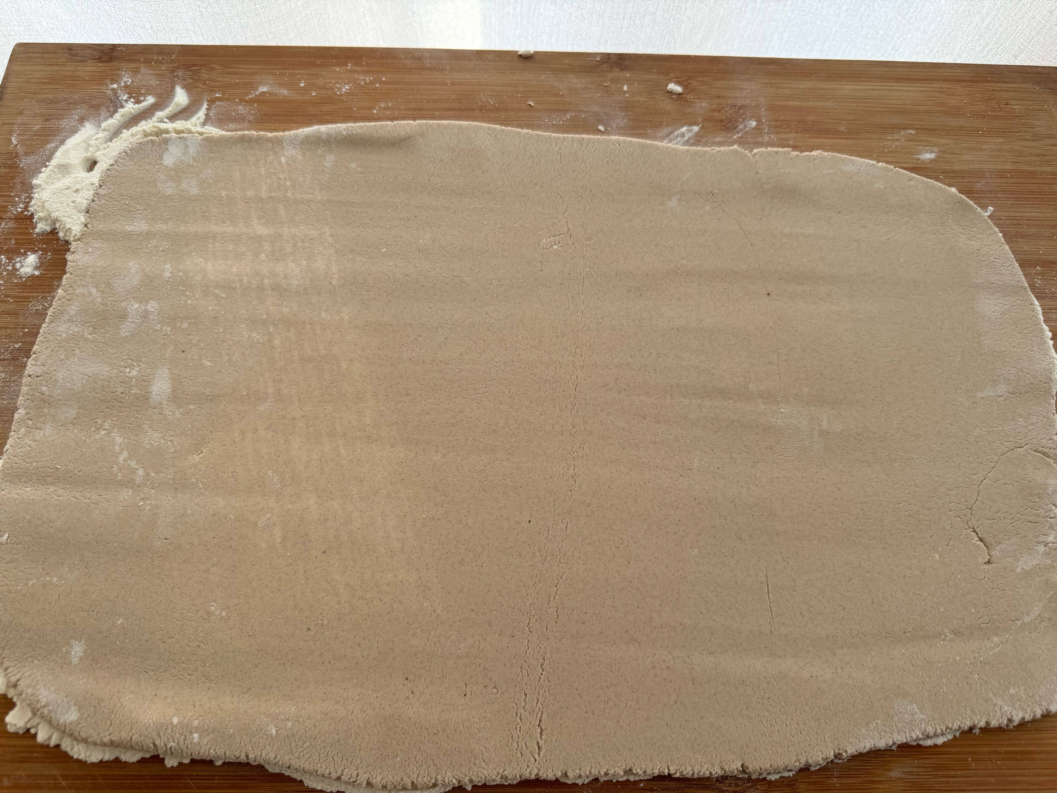 用擀面杖把面团擀成一个长方形的片状,不需要太薄,稍微有点厚度更好吃。