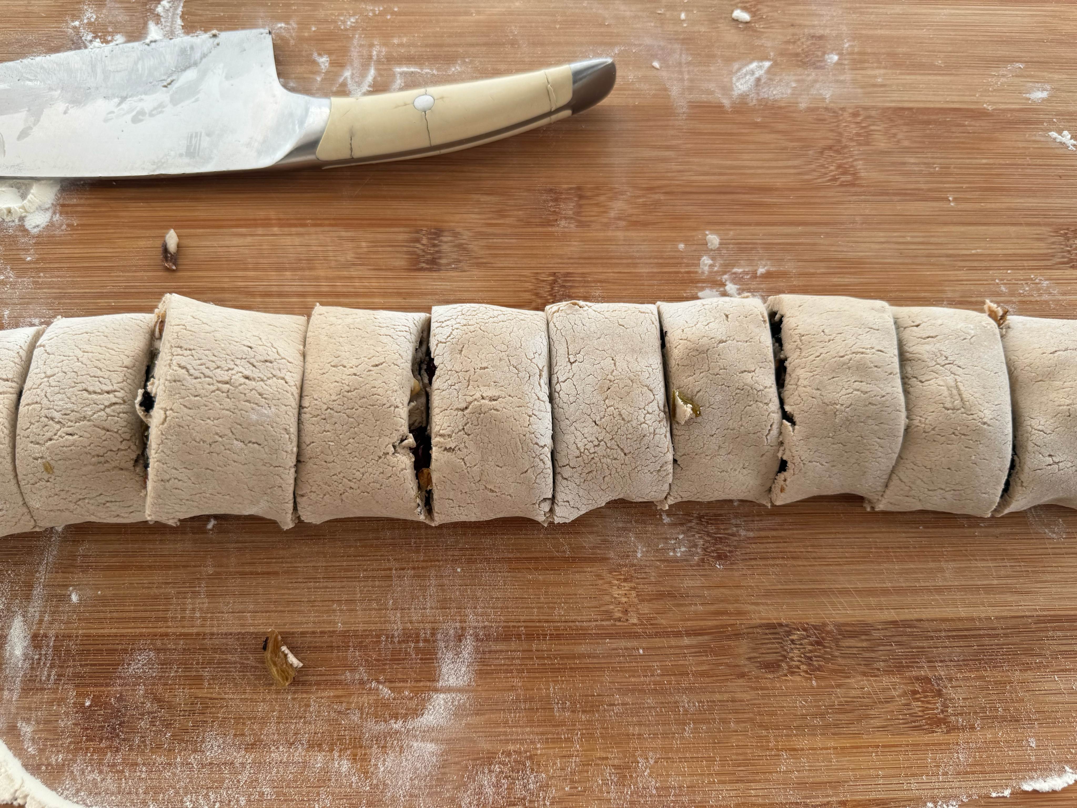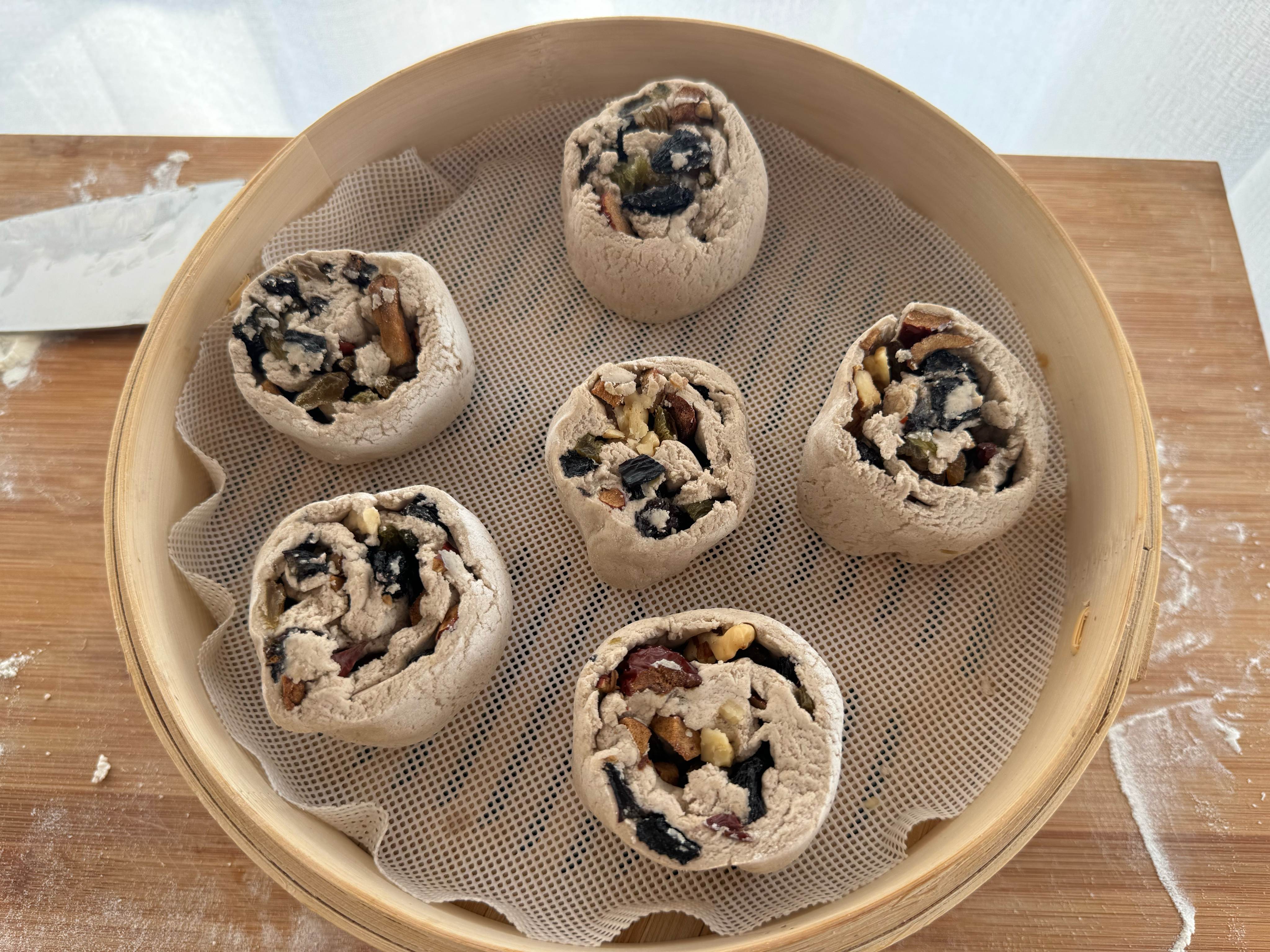 3,这一步没有拍到,把葡萄干,红枣碎,核桃碎均匀铺在面皮上,四周大概留出1厘米的空白,自上而下把面团卷起来,用刀切成小剂子。