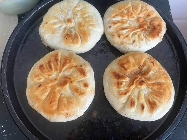 5、用平底锅或者是不粘锅都可以,先预热一下用油刷把锅底刷一层食用油,然后把包子胚放进锅底摁压一下,生饼胚的上面也要刷一层食用油,把锅盖盖好,烙2分钟,然后掀开锅盖把馅饼翻下面继续烙2分钟,馅饼两面金黄熟透烙熟盛出来就可以。