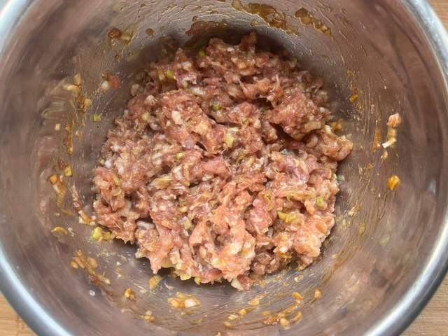 2、准备一斤猪肉馅,瘦肉多一些,葱姜剁碎后放入猪肉馅内,倒点料酒去腥、1勺蚝油、2勺味极鲜、少许十三香和香油充分的搅拌均匀,把猪肉馅腌入味。