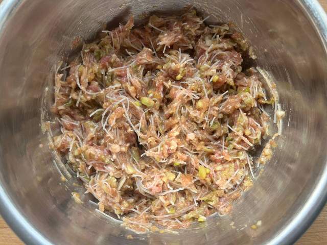 3、取一小把粉丝用清水浸泡一下,泡软后切成小段,把粉丝和茄子碎都放入入肉馅内,倒上一勺食用油、适量的盐搅拌均匀,菜馅闻起来香香的就可以。