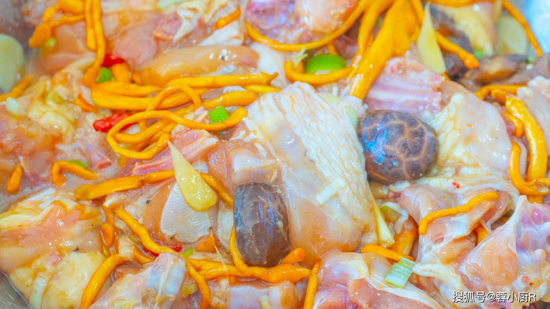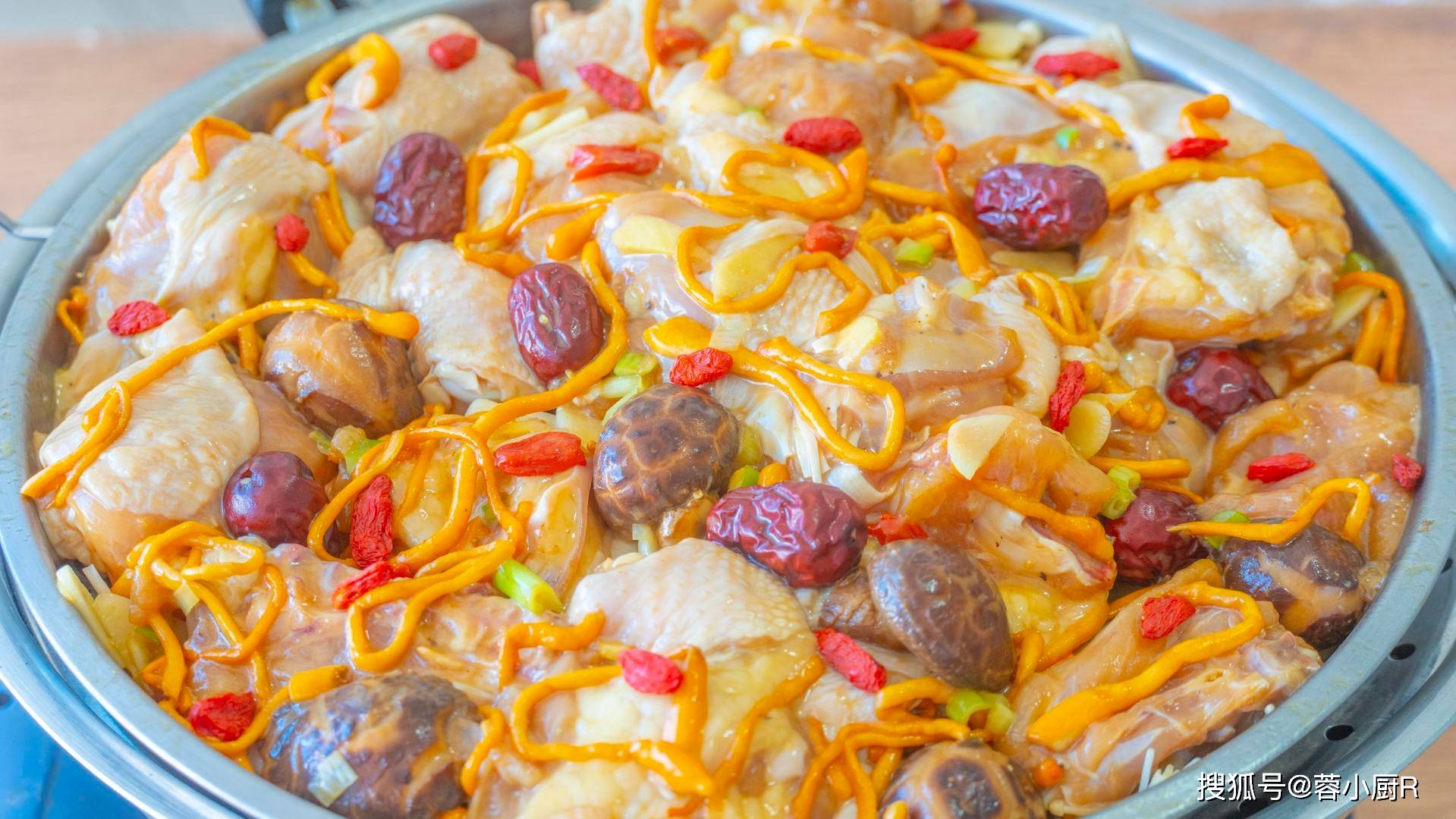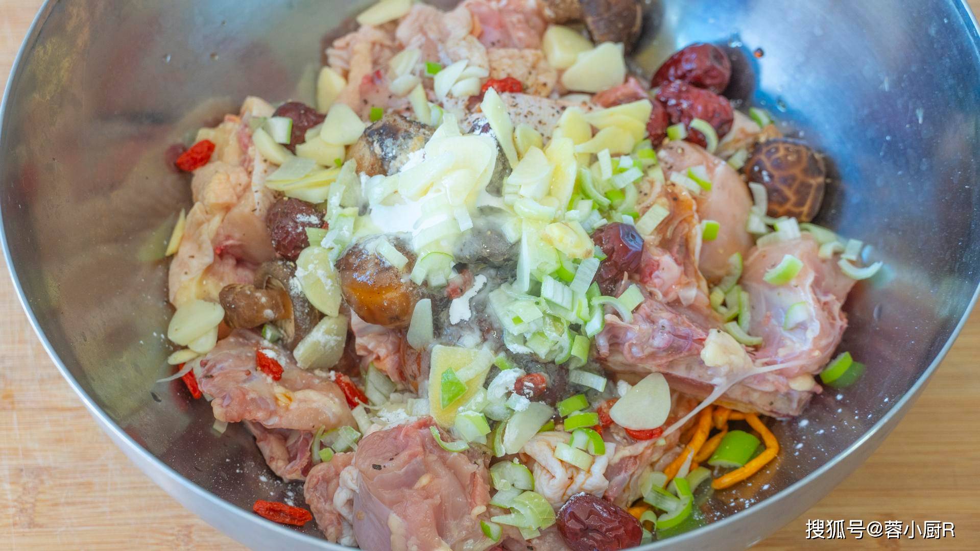 5、接着往虫草菇里面加鸡肉、香菇、红枣、枸杞、盐、生抽、料酒、蚝油、胡椒粉、淀粉、葱、姜、蒜、花生油。