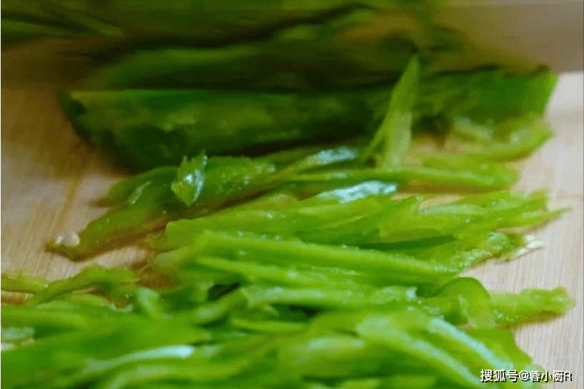 2、青椒1个,洗净切丝,大蒜切碎末。