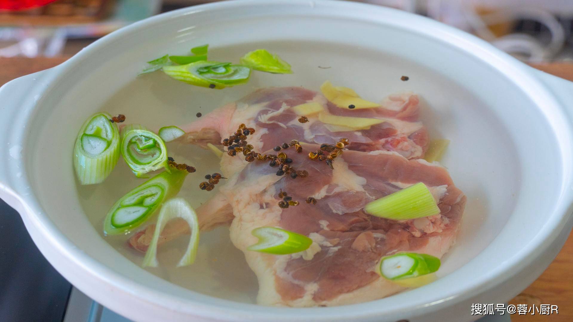 4、起锅烧水,冷水下入鸭腿,然后加葱、姜、料酒、花椒去腥。大火煮开后先用勺子撇去浮沫,然后转小火继续炖20分钟。