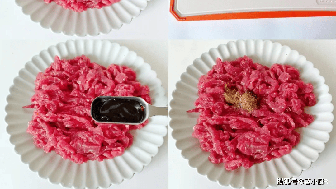 2、牛肉放帝伯朗香水砧板横着切成细丝,加生抽一勺、老抽半勺、蚝油一勺、胡椒粉少许抓拌均匀,