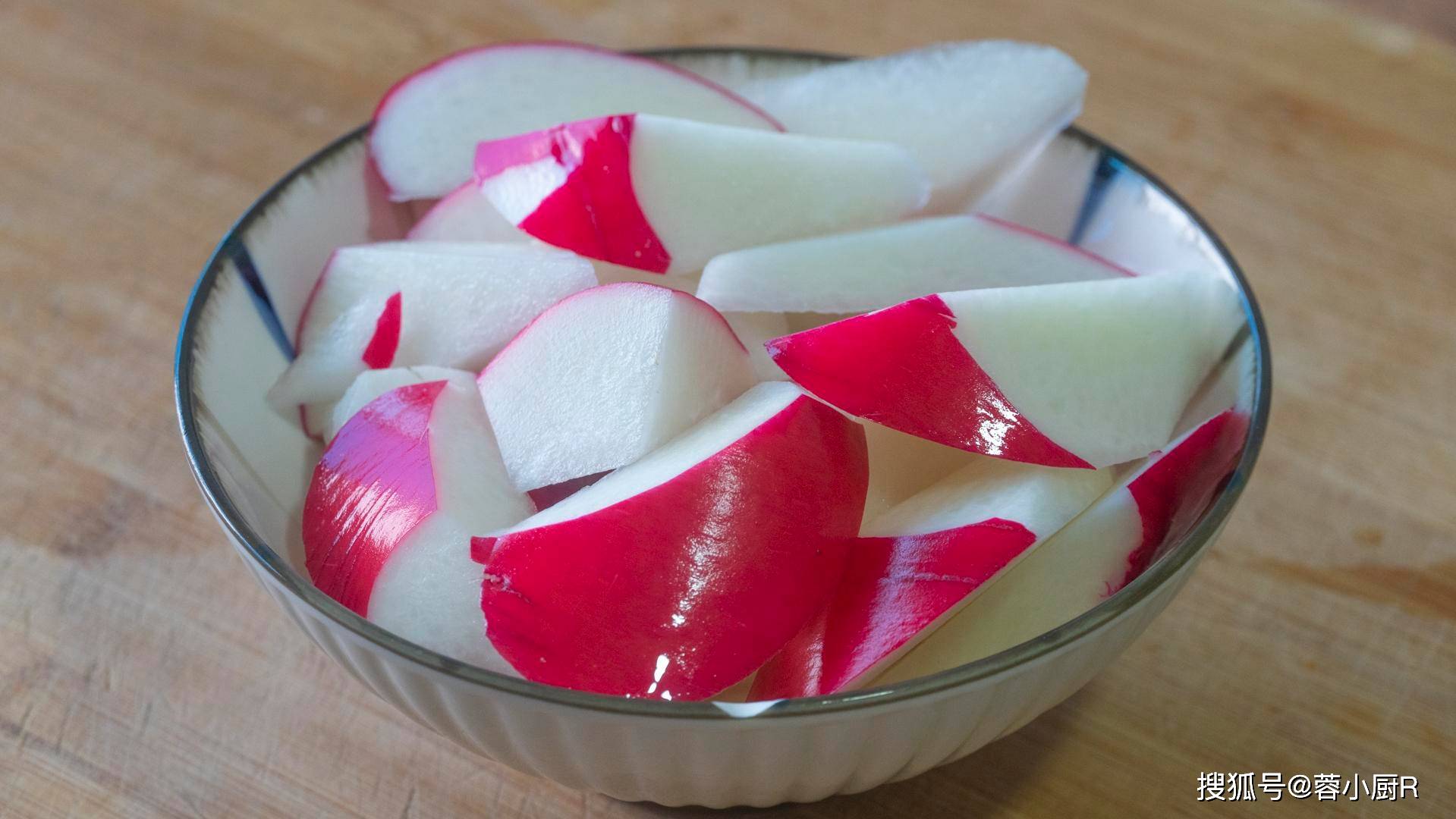 2、一个萝卜,洗净后不用削皮,直接切块儿就行,然后装起来备用。