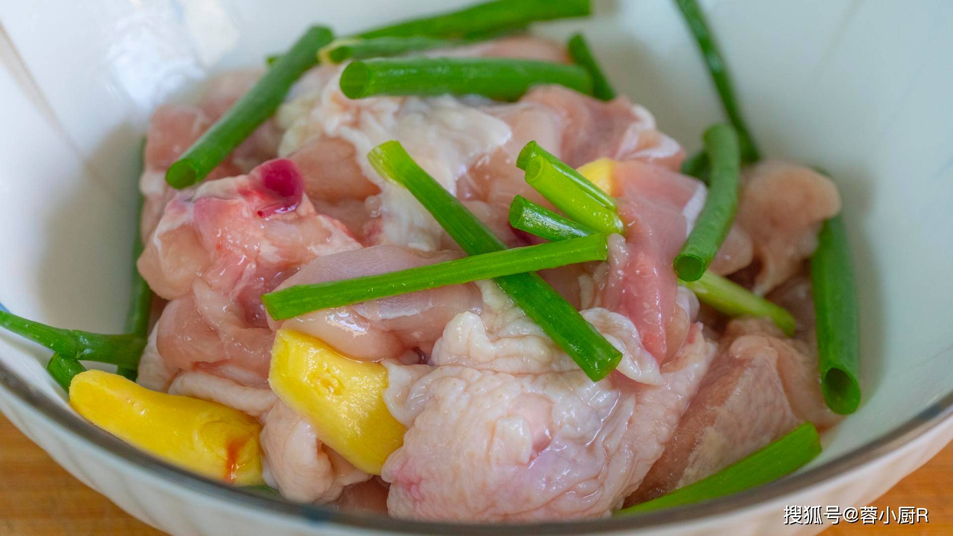 2、处理好的鸡腿肉切成大块儿,然后装入碗里开始腌制;加葱段、姜片、料酒去腥,然后再加盐、生抽、胡椒粉入个底味,最后加一小勺淀粉和一勺花生油抓拌均匀,接着腌制20分钟。