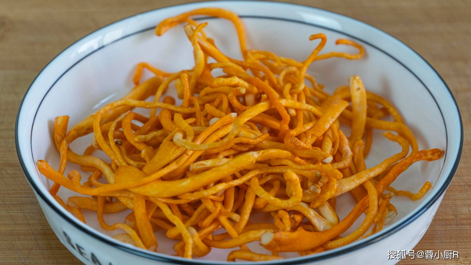 5、加圆椒丝虫草花炒熟,最后放辣椒丝,少许盐调味即可。