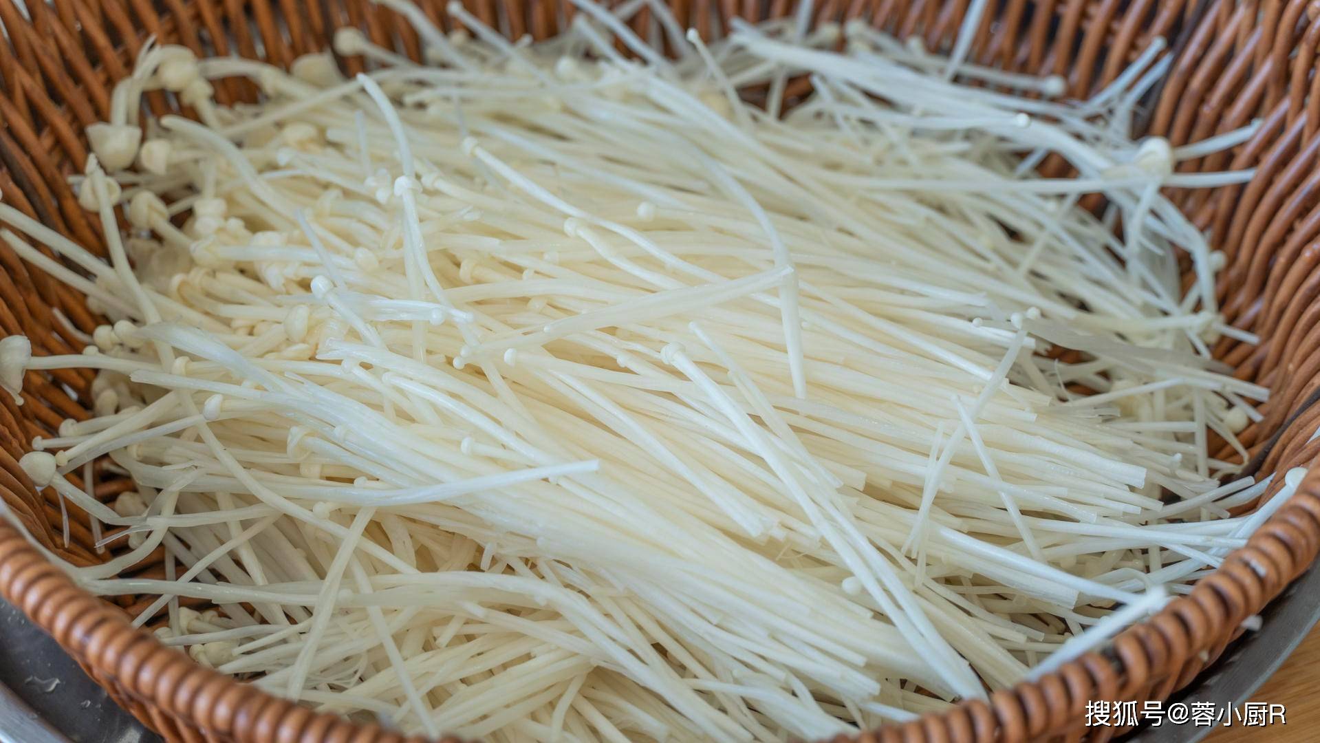 2、金针菇一小把,先切掉根部,然后掰成小朵后清洗干净,接着也沥干水分备用。