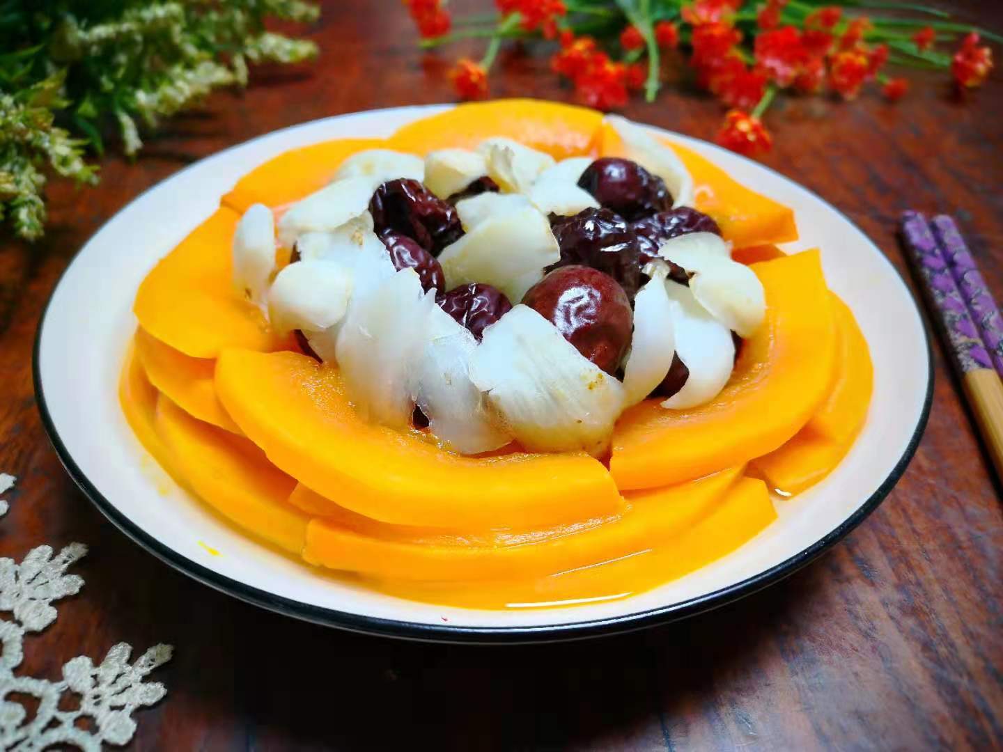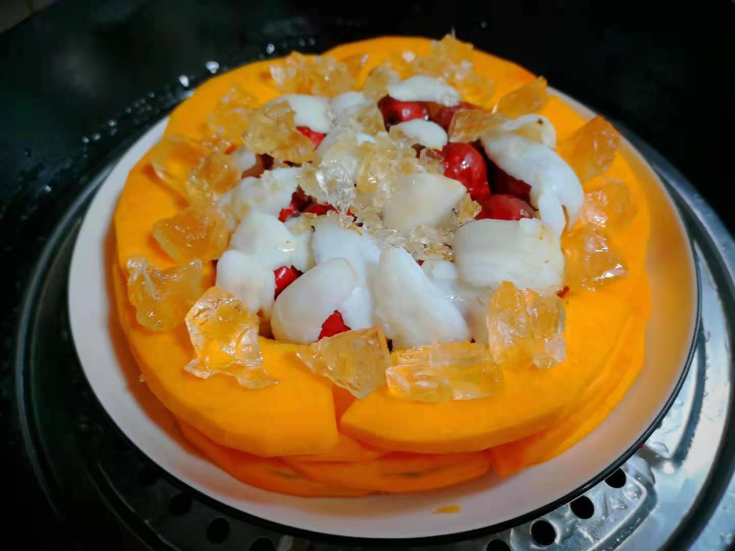 4、将碎冰糖块,撒在食材上面,再加入一点清水,放入蒸锅中,水开后,继续,中火蒸20分钟左右,南瓜变软,冰糖融化,就可以出锅了,一道老少皆宜的健康菜,营养滋补,软糯可口、清淡不油腻,秋天吃正当时。