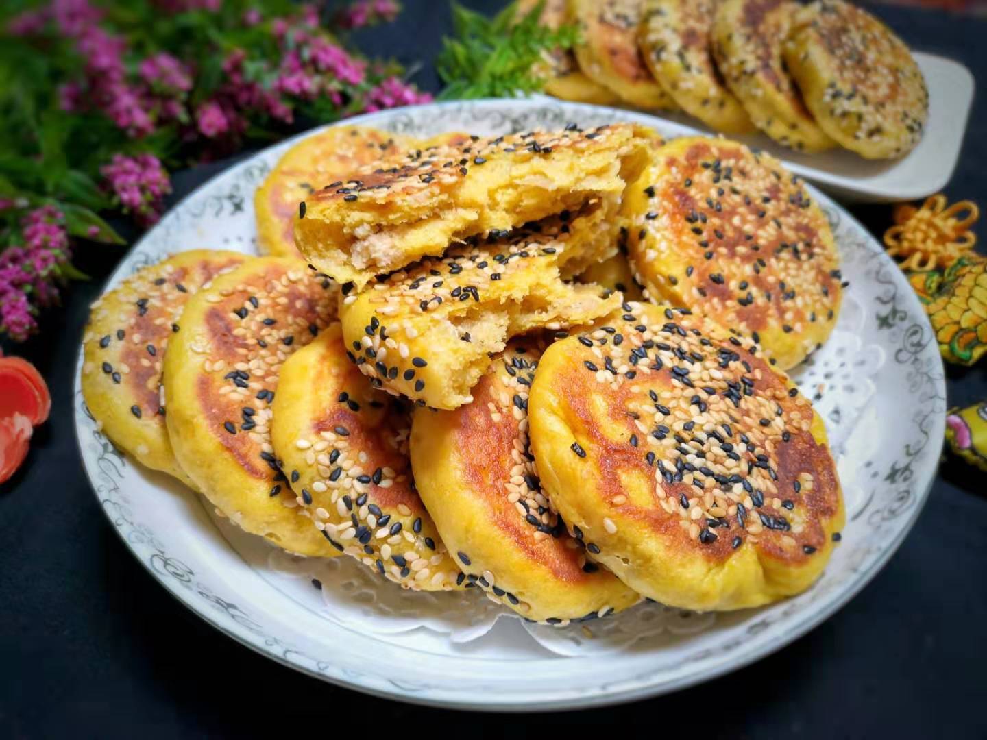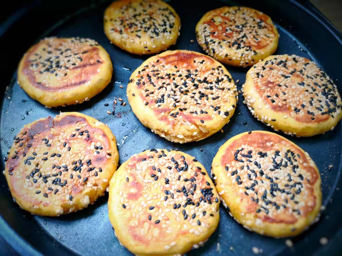 7、全部做好,盖上保鲜膜,醒发20分钟拿起来轻飘飘的就可以了,电饼铛锅抹上一层油,放入南瓜饼用馅饼键,盖上盖子焖3分钟,揭盖翻面再焖3分钟,两面金黄出锅,咬一口外酥里嫩,花生香味十足,外皮还掉渣呢。