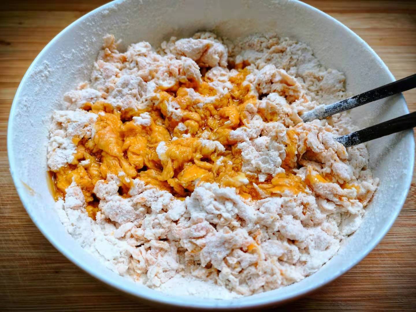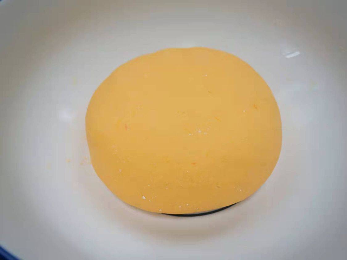 3、再加入适量糯米粉,糯米粉的量根据南瓜的水量来添加,用筷子搅拌成絮状,揉成光滑不沾手,偏软的面团,放在盆里,静置一会。
