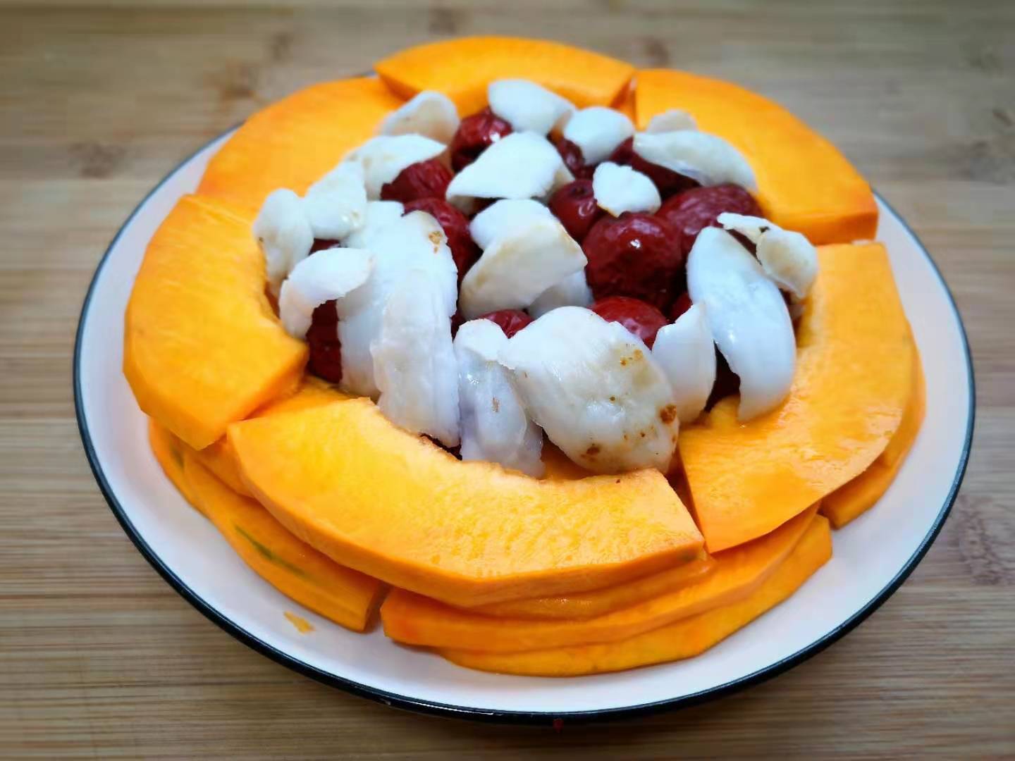 做法:1、准备半个南瓜,适量红枣、百合、和冰糖,将冰糖块敲碎一些,新鲜南瓜,用汤匙挖出里面的瓜子,削去外皮,切成薄点的大片状,将南瓜片摆放盘子一圈,边角料放在中间。
