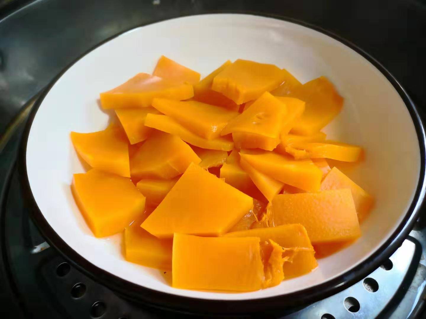 做法:1、南瓜去皮切块,上锅蒸15分钟,蒸南瓜的时间开始炒花生米。