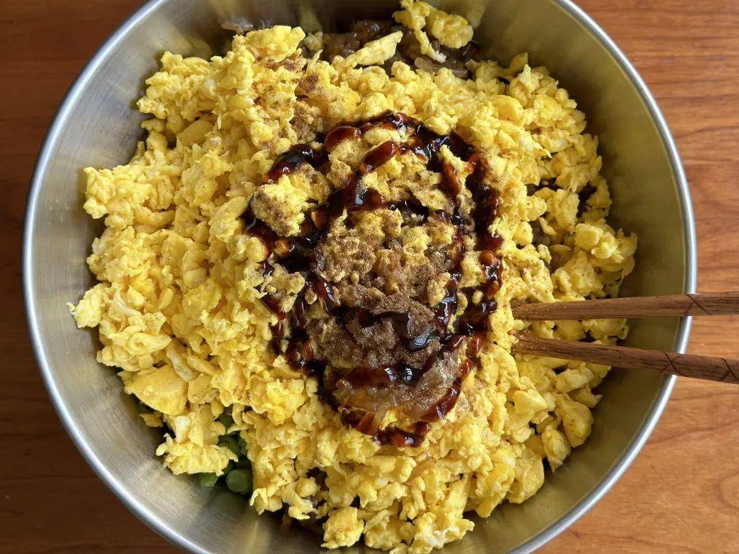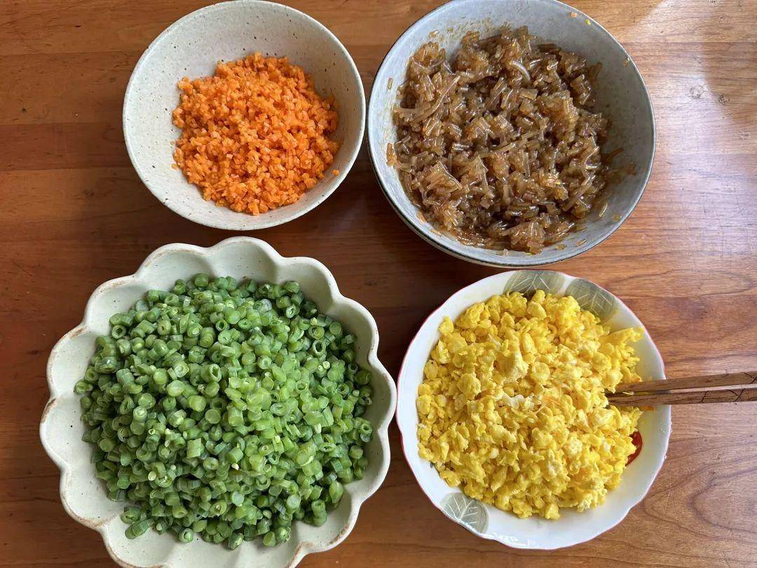 3、将冷却的鸡蛋、炒软的胡萝卜丁、拌好的粉条以及任何你喜欢的配料(如葱花、木耳碎等)一同放入大盆中。随后,根据个人口味加入适量的五香粉提香、蚝油增鲜、盐调味、再滴入几滴香油或融化的猪油增加滑润感,所有食材与调料充分拌匀,直至馅料色泽诱人,香气四溢。