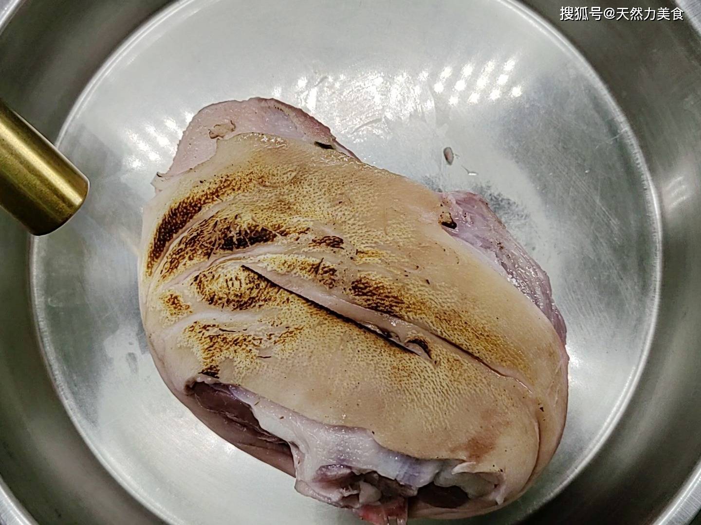 2、我们在烧皮的时候可以烧久一些,这样更能破坏猪皮上的汗腺,去异味效果就会越好,烧好后把肘子放温水中浸泡一会,然后用刀把猪皮刮一下,把烧黑的猪皮给刮干净,刮干净后再清洗一下后控水备用。这样猪皮上的腥膻味就基本上去除干净了,吃起来才好吃。