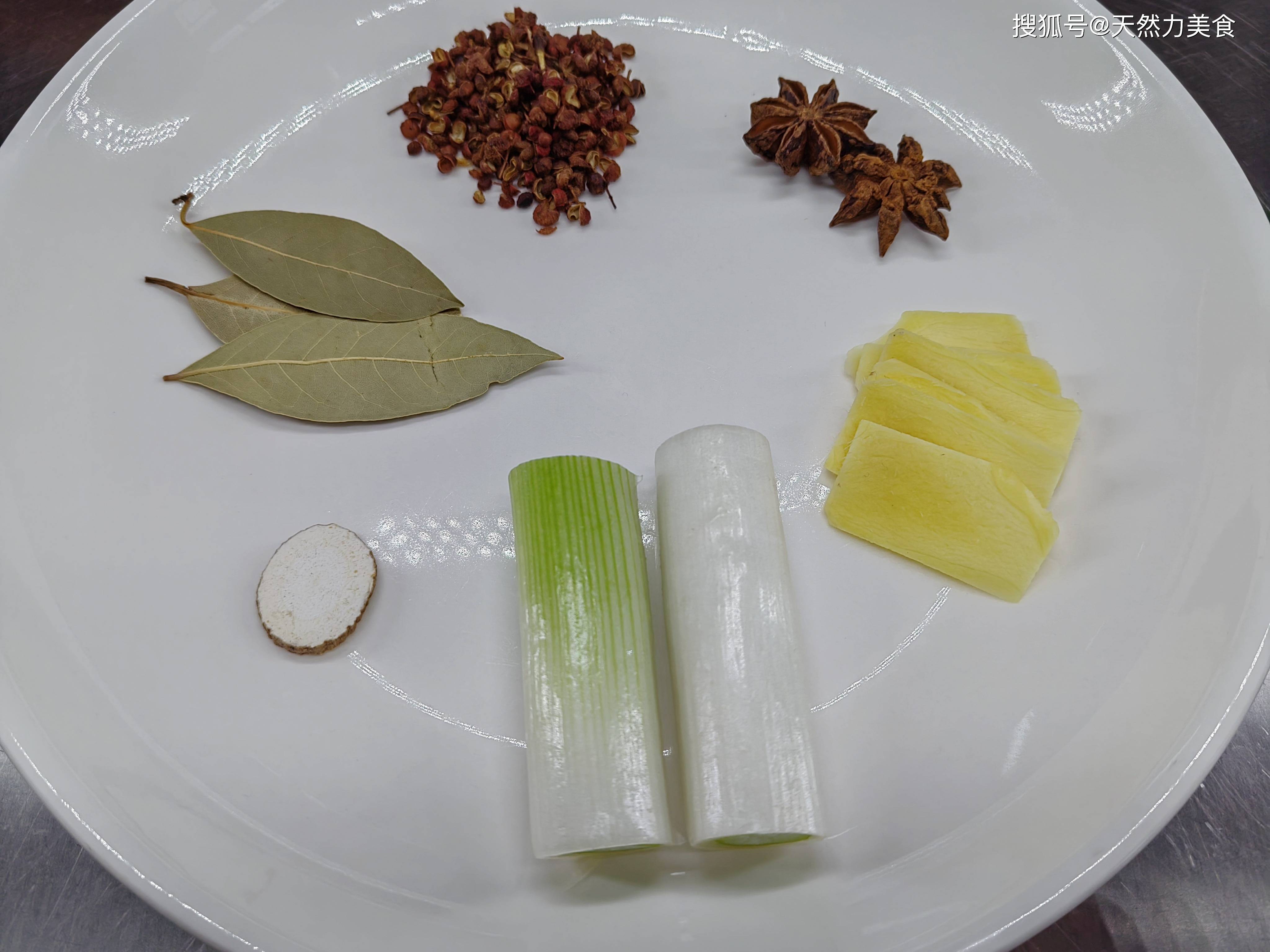 3、虽说是蒜香肘子,我们还是要用一些其它的香料来增香提味,要准备的有大葱100克,生姜10克,八角2个,花椒5克,香叶3片,白芷1片。