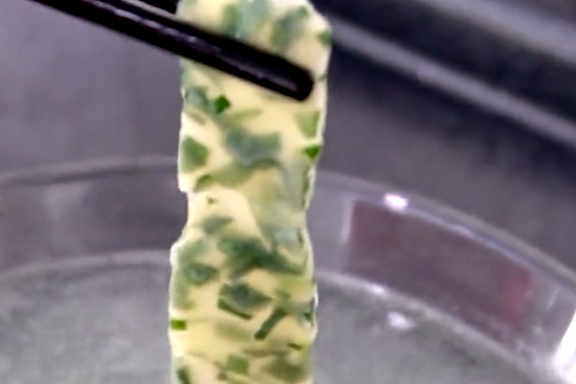 第三步:在锅里烧开水,加上一点食盐,把面皮放进去煮熟,最后捞出来过一遍凉水,使凉皮快速冷却。