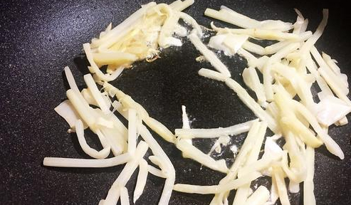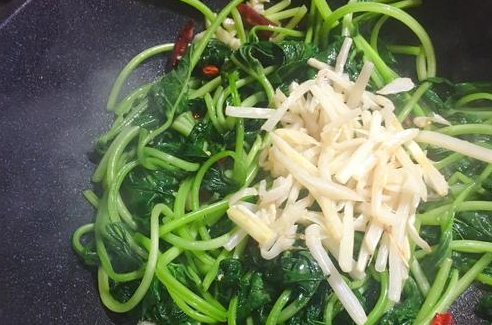 我们这边炒红薯叶的时候,还要加一些酸笋,在网上和超市都是可以买到的,先把酸笋放在热锅里面翻炒,把里面的水分炒干,然后在里面放一些花生油,等花生油热的时候,把酸笋盛出来,继续往锅里面倒一些油,把蒜和干辣椒爆香,然后把红薯叶放到锅里面,放一勺料酒,炒的时候记得用大火。