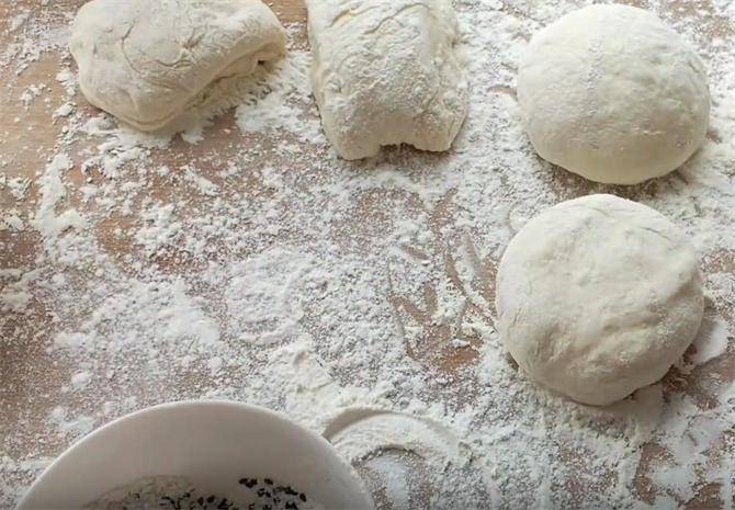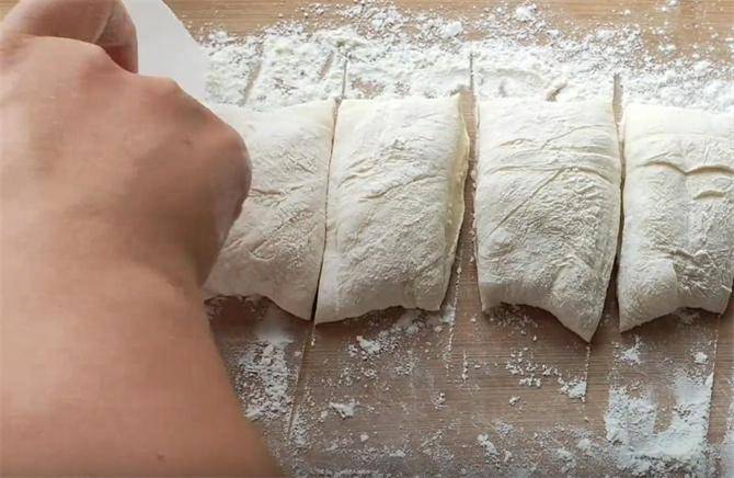 2.因为这个季节温度比较高,我这个面糊大约发酵了25分钟就发好了,然后我们再利用干面粉,把面糊放在案板上整理成长条形,一定不要揉面,保持面原来的柔软性和气孔,然后把它分成6份。