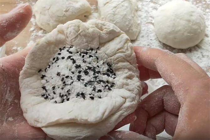 4.面团中的水分含量越多,做出来的饼就会越松软不硬,全程我们要多利用一些干面粉,防止粘手和粘案板,把它稍微按薄,放入馅料,像包包子那样封口即可。