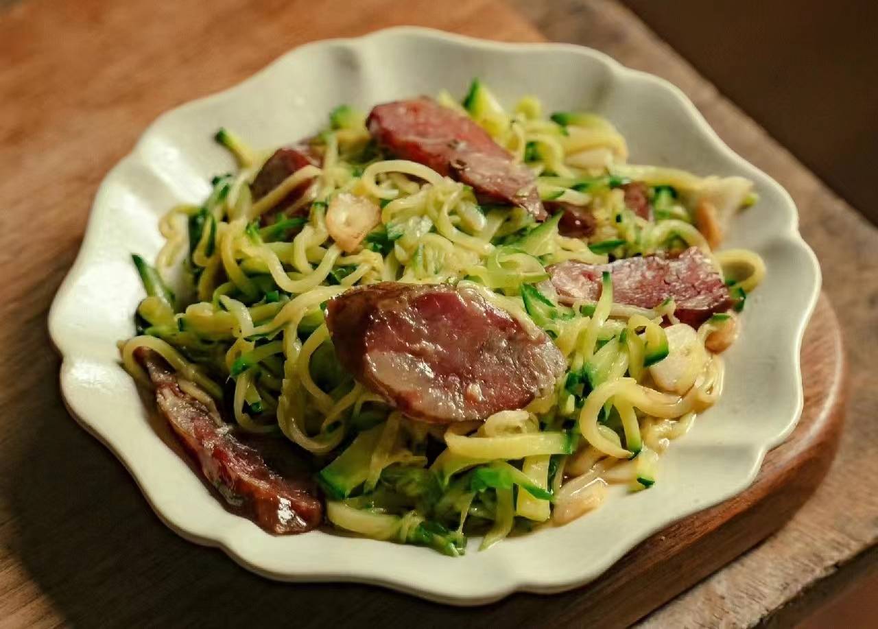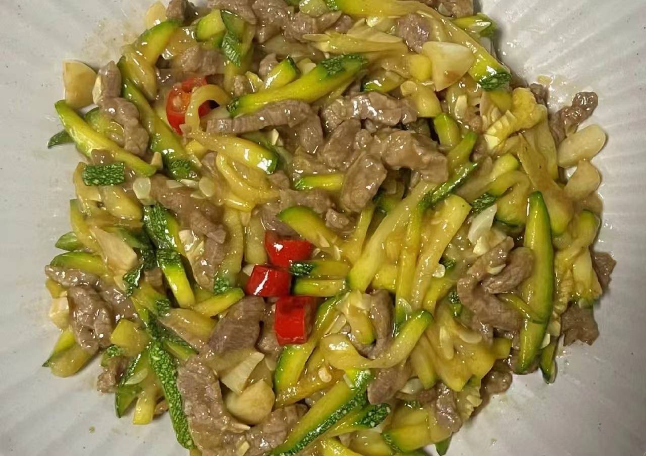 食材:牛肉、嫩南瓜、盐、生抽、淀粉、姜蒜、小米椒、胡椒粉