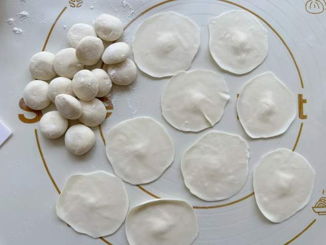 3、取300克优质面粉,缓缓加入140克清水,边加边搅拌,直至面粉成絮状。随后,用手掌根部的力量将面粉揉成光滑、有弹性的面团。在温暖的地方静置醒发1个小时以上。醒发好的面团取出,放在案板上再次揉匀,然后分割成大小均匀的小剂子。取一个小剂子,用擀面杖轻轻擀开,注意中间厚、边缘薄,这样包出来的饺子既不易破皮,又能保证馅料的充足。