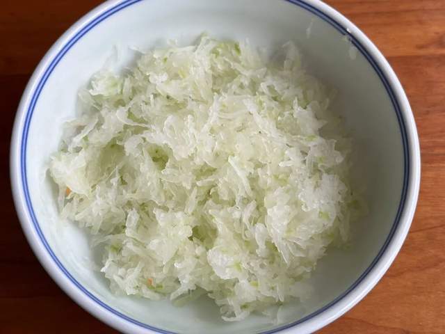 1、挑选一个新鲜、翠绿的冬瓜,轻轻削去其坚韧的外皮,露出里面洁白如玉的瓜肉。接着,利用擦丝器将冬瓜细致地擦成细丝。随后,在冬瓜丝中撒入适量的盐,轻轻拌匀,静置片刻,让盐分缓缓渗透,渗出冬瓜中多余的水分,再挤干水分备用;