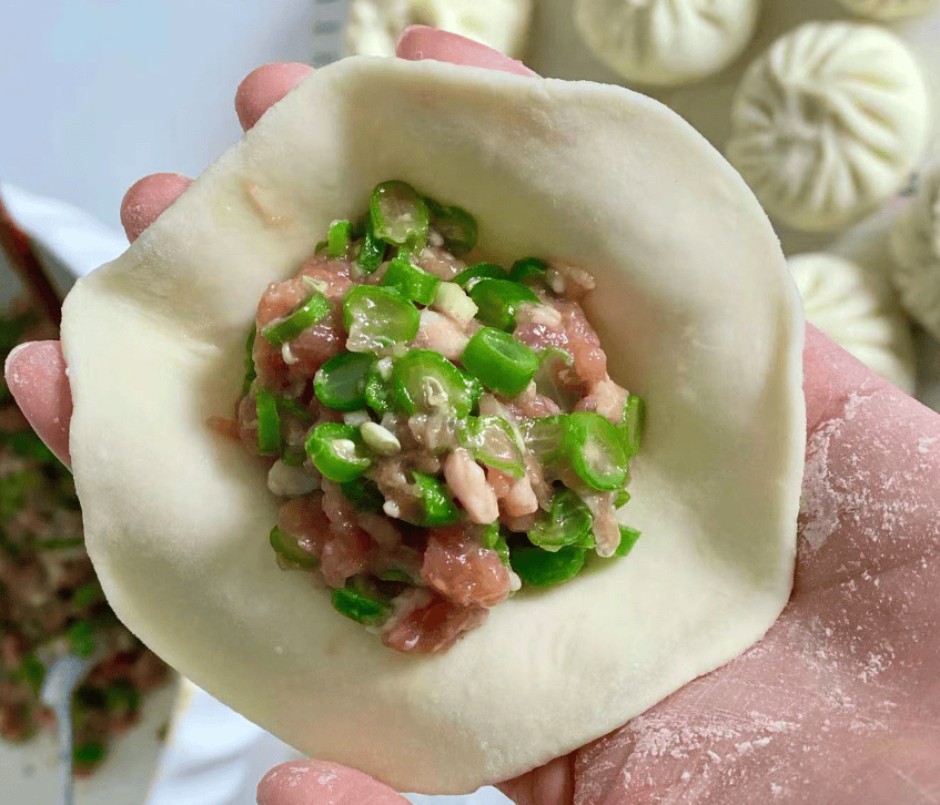 8、面粉加水加酵母揉成面团,发酵至2倍大揉排气,分成下面剂子,然后擀成中间厚四周薄的包子皮,包入适量的豇豆猪肉馅。