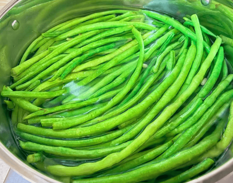 2、豇豆洗净沸水下锅焯水,加入少许油和盐一起。