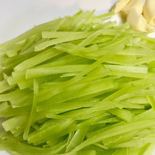 莴笋可是个好东西,可生食、凉拌、炒食、干制或腌渍。儿童多吃莴笋对生长发育很有益处,此外还含丰富的磷与钙,对促进骨骼的正常发育,预防佝偻病,帮助正常长牙都是很有好处的。蒜头炒莴笋丝虽然只是用极其简单的调料和手法炒制,但是口感爽脆可口,没有了莴笋自带的微微苦味,倒是一口接一口地吃出了丝丝甜味。