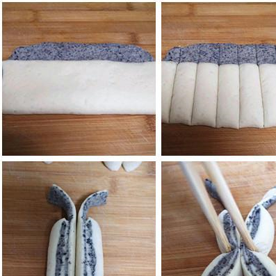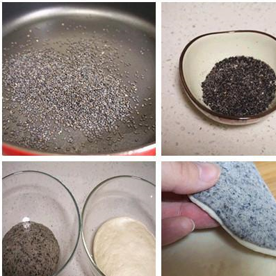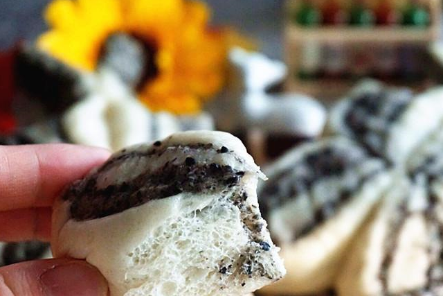 2、300克面粉均分2份,酵母3克用温水化开,一份里面加入黑芝麻粉,另一份是白面团,两个面团揉好后覆盖保鲜膜,放在温暖处发酵到两倍大左右。