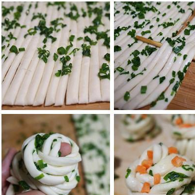 5、4-5根为一组,挑出来后用筷子一个方向扭成团,两端在手中都卷到下面,捏在一起。