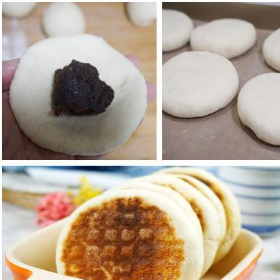 5、电饼铛里刷上一层油预热,接着放入红豆饼,选择馅饼档位,煎至双面金黄即可。